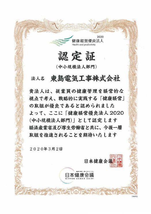 東島電気工事株式会社はこの度、健康経営優良法人2020(中小規模法人部門)に認定されました。