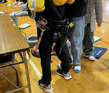 私たちは材料の紹介をしたり、工事に使用する道具を生徒と一緒に使ってみたりして、